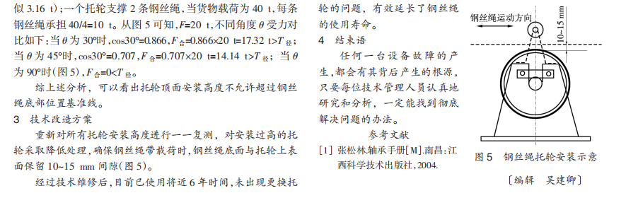 鋼絲繩托輪作用是鋼絲繩在自身重力作用下發生下垂時支撐住鋼絲繩來回運動,確保不與臂架結構件表面直接產生剛性摩擦。如果鋼絲繩托輪安裝出問題,輕則門機無法正常使用,重則會造成鋼絲繩加劇磨損,最終導致鋼絲繩發生斷裂,引發生產安全事故。海南八所港務有限責任公司于2008年購置2臺MQ2533門座式起重機,在使用過程中發現起升鋼絲繩托輪經常損壞,主要表現在托輪被磨穿斷裂,維修更換頻率比較高,鋼絲繩使用壽命也比其他門機要短的多。針對這一問題,組織相關技術人員進行深入研究和分析,發現托輪磨穿及鋼絲繩使用壽命短的主要原因是維修人員在安裝托輪時安裝過高,造成鋼絲繩來回運動時托輪受到鋼絲繩頻繁摩擦和擠壓,加速托輪磨損而發生斷裂,同時也加劇鋼絲繩的磨損,通過技術改造后,托輪磨穿問題得到徹底解決,連續使用6年時間,未再發生托輪被磨穿斷裂問題,同時延長鋼絲繩使用壽命。