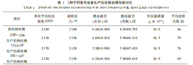 19M等不同結構、規(guī)格的鋼絲繩進行鍛打試驗,并對比破斷拉力、疲勞性能、表面質量等性能,結果證實,采用HE-16V設備生產的鍛打鋼絲繩與715/F DZP-200生產的鋼絲繩相比,各項指標均具有較大的優(yōu)勢,最終決定引進德國HE-16V旋鍛機進行研發(fā)、生產。