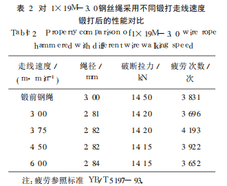 在鍛打過程中,對同一根鋼絲繩,采用不同的走線速度進行鍛打,其性能也大不相同,對比試驗結果見表2